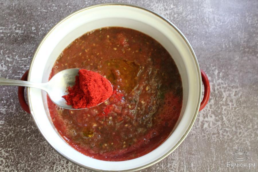 4. Добавить в соус сладкую паприку и поставить посуду на огонь. Уваривать соус до нужной густоты, помешивать.