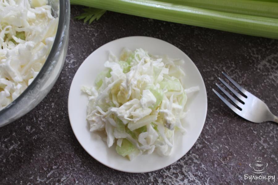Картофельный салат с капустой, стеблем сельдерея и яйцами, разнообразит повседневное меню. Такой салат получается вкусный, хрустящий, ароматный и сытный. Если вы не любите заправлять салаты майонезом, то его вполне можно заменить на сметану. Салат готовится из доступных продуктов и порадует вас своим вкусом. По желанию, в салат можно добавить мелко нарезанную любимую зелень, но и без зелени этот салат получается замечательный.