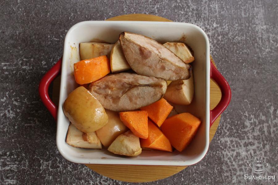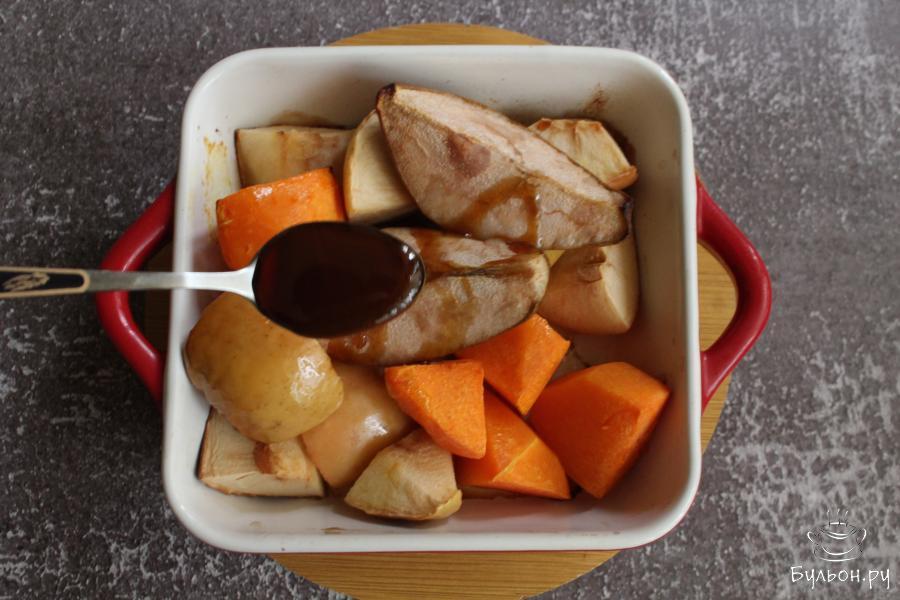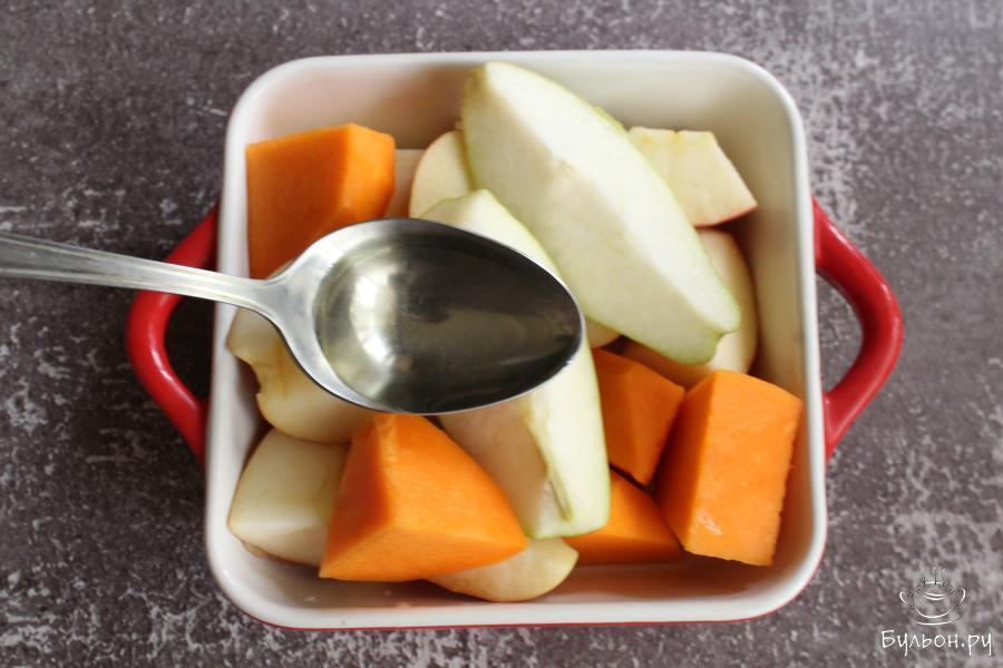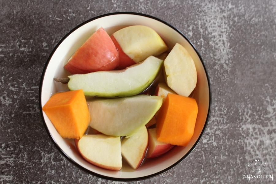 1. Тыкву почистить, у яблок и груш вырезать сердцевинки. Тыкву и яблоки нарезать крупными кубиками, груши разрезать на половинки. Все выкладывать в воду, чтобы фрукты не потемнели, пока нарезаем.