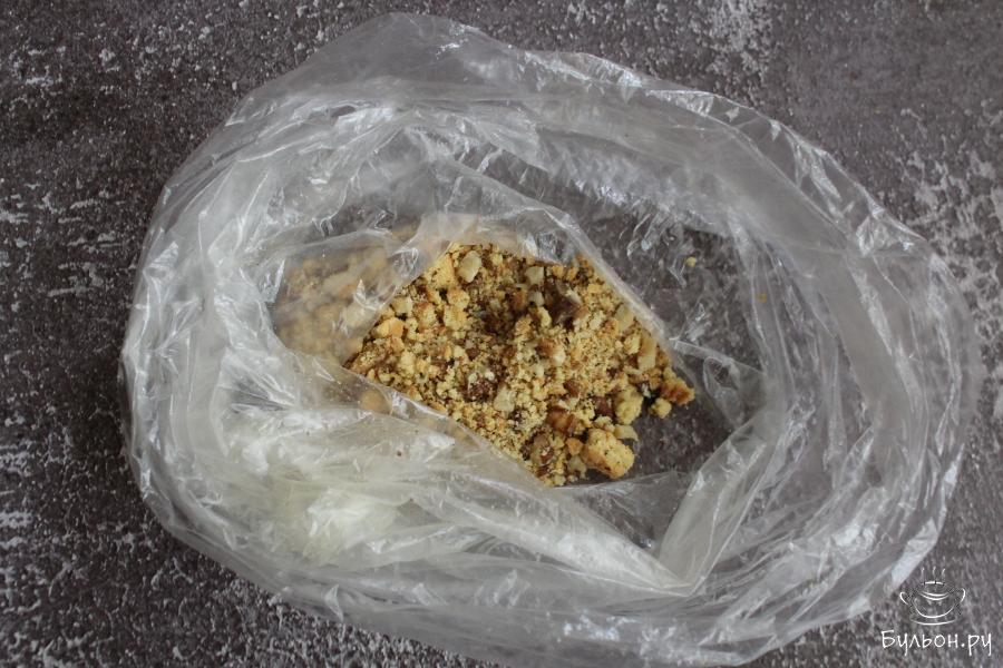 4. Любое постное печенье и грецкие орехи выложить в пакет и прокатать скалкой, чтобы получилась крошка.