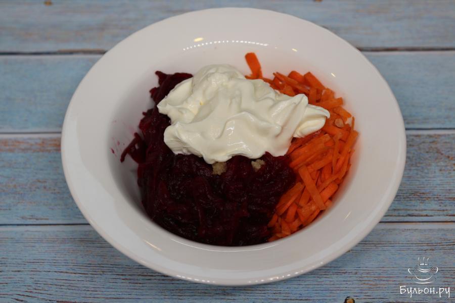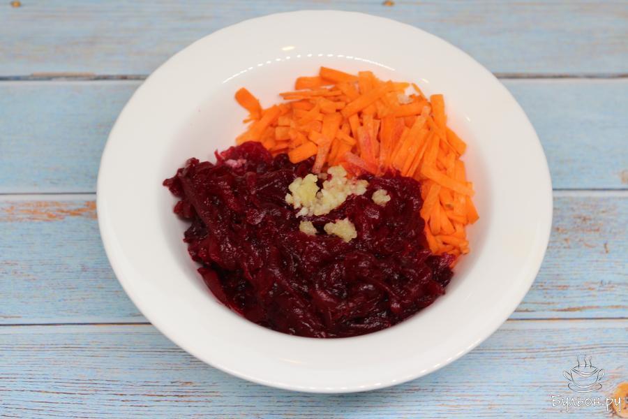 3. В тарелку выложите морковку и свеклу. Свеклу выкладывайте без сока, немного отжав ее, но не сильно. Салат не должен плавать, но и не должен быть слишком сухим. Зубчики чеснока измельчите и также добавьте к салату.