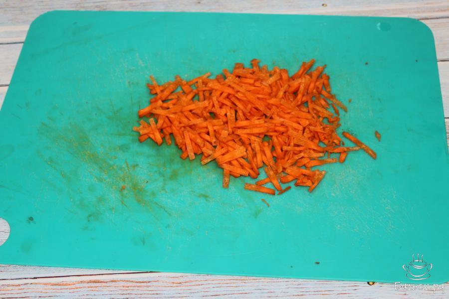 1. Морковь очистите, нарежьте на продолговатые тонкие слайсы. Затем слайсы разрежьте вдоль на 2 или 3 части, в зависимости от толщины моркови. После морковь мелко нашинкуйте.
