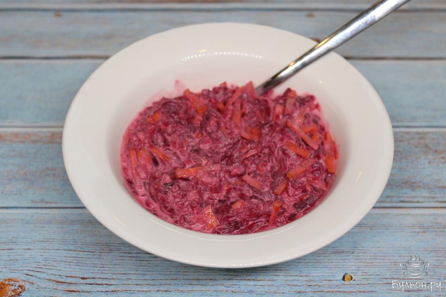 Из самого названия салата уже понятно из чего он приготовлен. Остается лишь добавить в него еще чеснока для придания салатику остроты и соли. чтобы он не был пресноватым. Сочетает в себе мягкую свеклу, хрустящую морковь, ароматный острый чеснок и жирную сливочную сметану. Готовится он в три счета. Сметанный салат из свеклы и моркови подойдет для обычного, семейного, будничного приема пищи. Но также данный салат является и закусочным, он хорош в качестве закуски к водке. Так что такой салат можно и гостям подать.