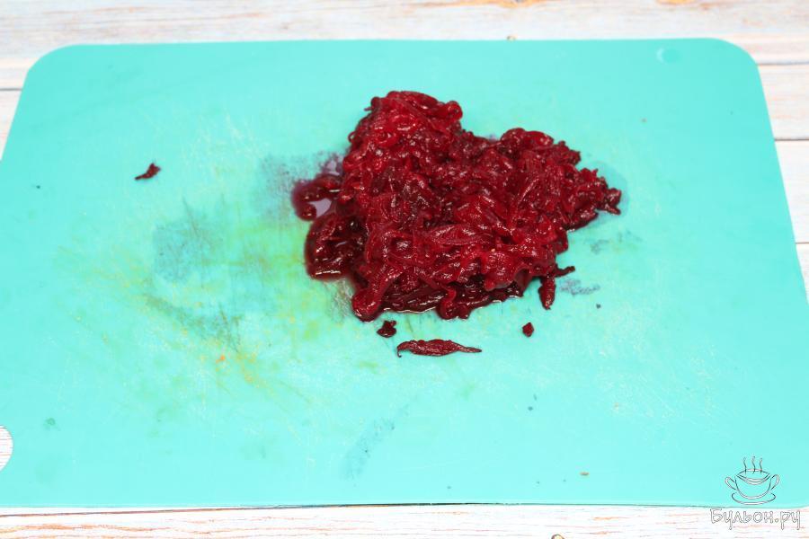 2. Заранее отварите свеклу, поскольку при приготовлении салата она не должна быть горячей или теплой, она должны быть холодной. Очищенную свеклу натрите на крупной терке.