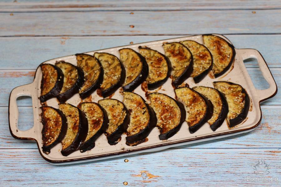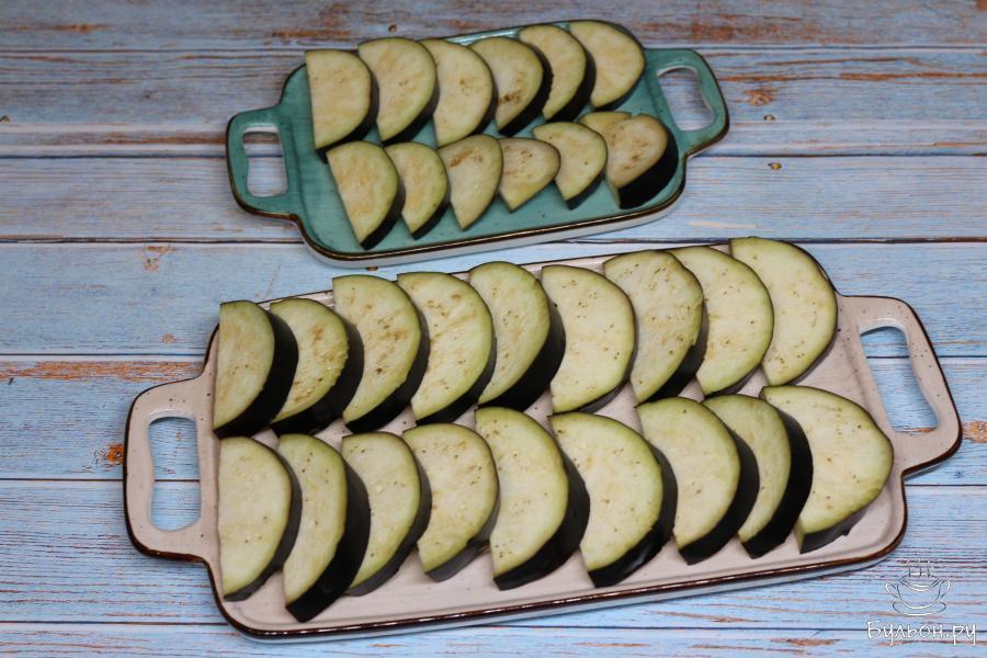 4. Выложите баклажаны в форму для запекания или в маленький противень, в нахлест друг на друга. При необходимости, слегка подсолите баклажаны.