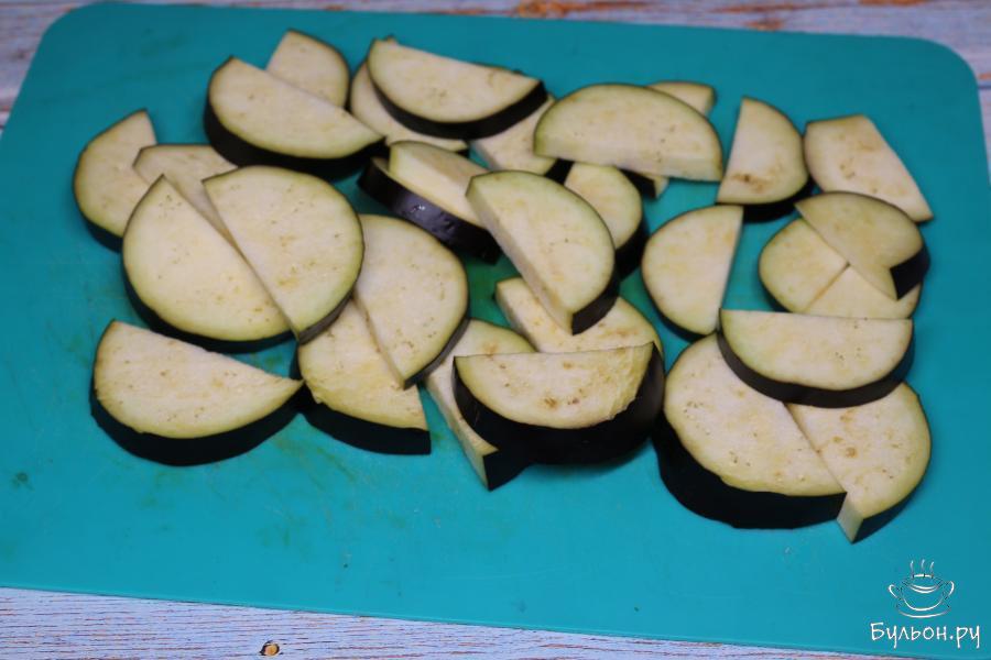 3. Баклажан нарежьте кольцами, которые разделите пополам, если у вас большой баклажан. Толщина кусочков должна быть примерно 1 см.