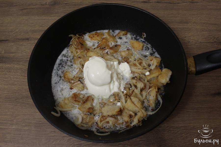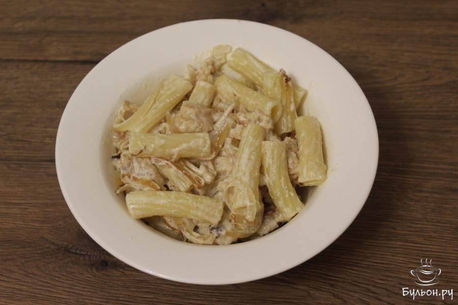 5. Отварные макароны добавьте в сковороду к минтаю в сметанном соусе, перемешайте и подайте на стол.
