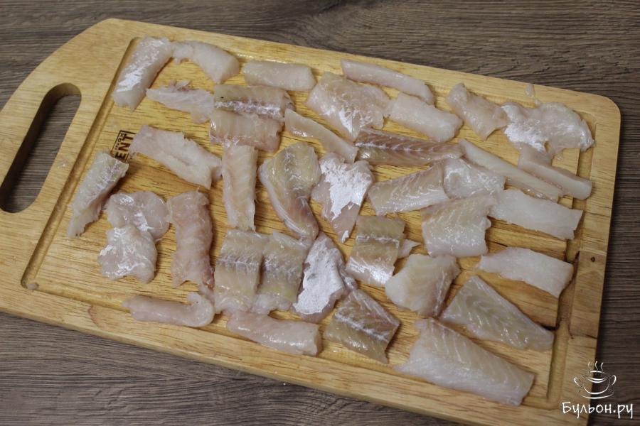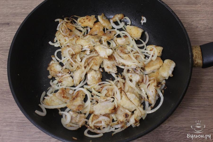 2. Кусочки минтая посолите, запанируйте в муке и обжарьте на растительном масле с двух сторон. Добавьте лук и еще немного обжарьте, помешивая рыбу с луком.