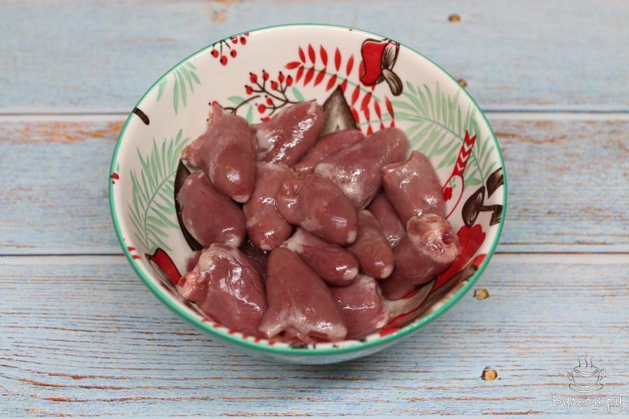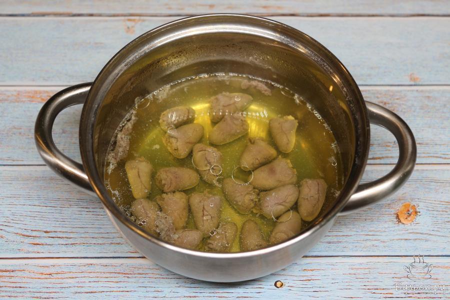 2. В кастрюльку влейте воду, доведите ее до кипения, добавьте соль и положите туда сердечки. Варите их 50 минут на несильном огне. Затем слейте бульон.