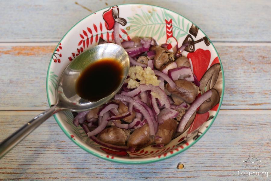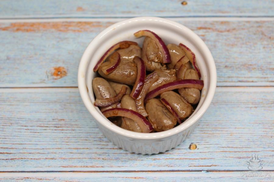 6. Перемешайте сердечки и оставьте их минимум на полчаса мариноваться в холодильнике. Перемешайте их несколько раз в течение времени маринования, чтобы они равномерно промариновались.