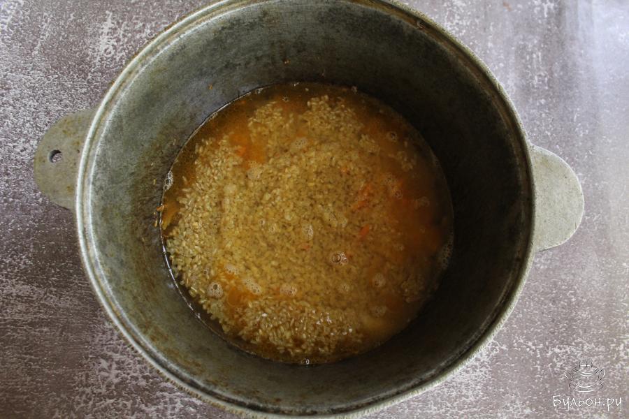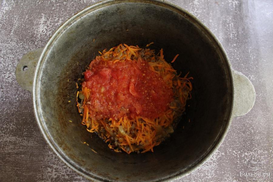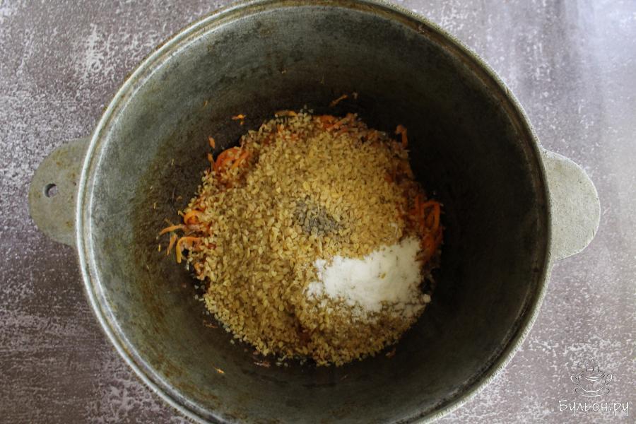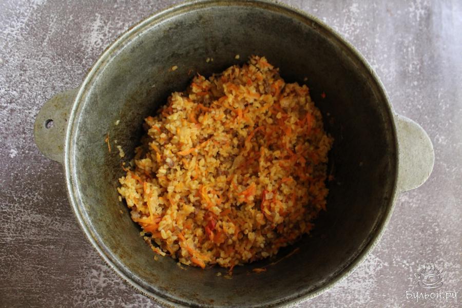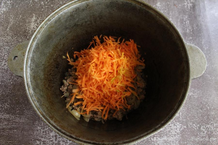 3. Морковь натереть через крупную терку и добавить в казан. Жарить все вместе еще несколько минут и помешивать.