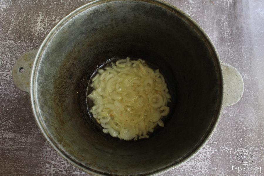 1. Лук и морковь почистить, овощи промыть. Лук мелко нарезать и обжарить до мягкости в казане с разогретым маслом.