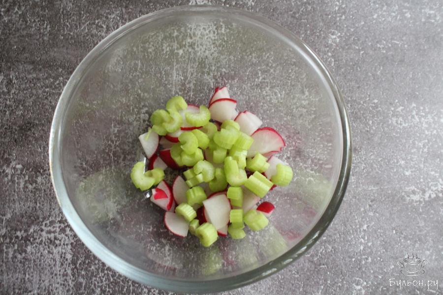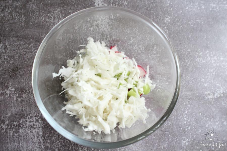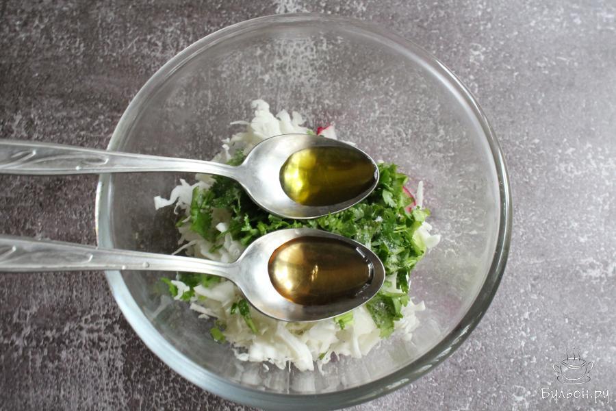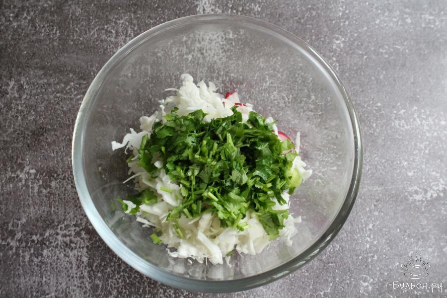 Прелесть этого салата не только в его насыщенном вкусе, еще он готовится очень быстро. Салат хрустящий, сочный, полезный и легкий. Такой салат подойдет не только для повседневного меню, его можно предложить худеющим, вегетарианцам, постящимся. Салат можно заправить любым любимым, душистым, растительным маслом, зелень тоже выбирайте по своему вкусу. Подать салат можно к обеду, ужину или просто перекусить в течение дня таким салатом.