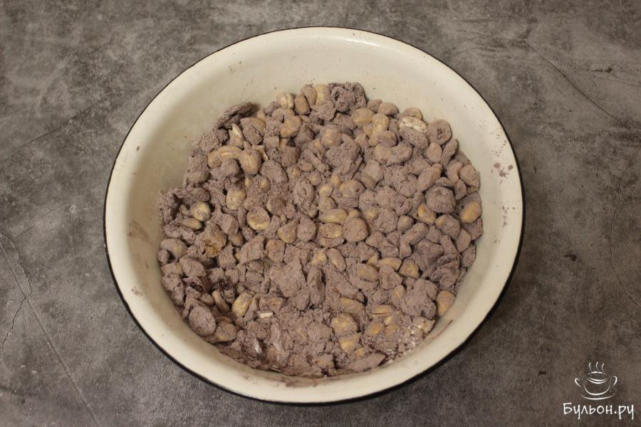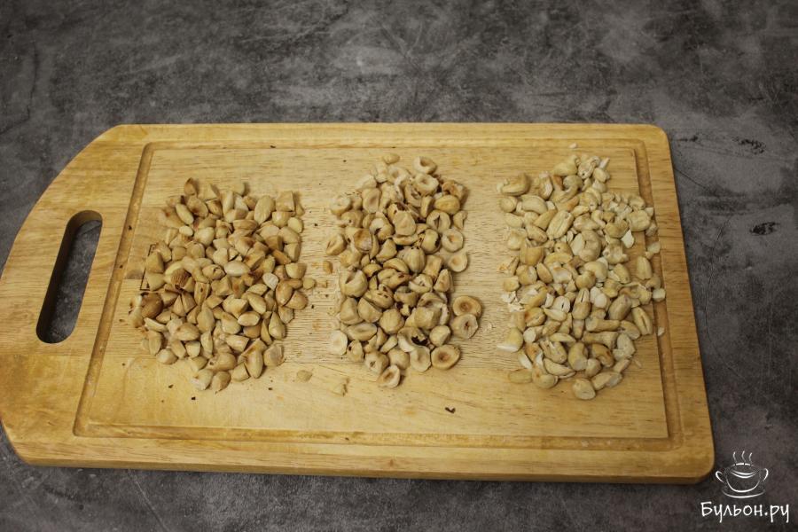 2. Залейте миндаль кипятком на 10 минут, затем слейте воду и снимите кожицу. Очищенный миндаль слегка обжарьте на сковороде. Затем на этой же сковороде просушите кешью. Также просушите фундук и снимите шелуху. Просушенные орехи крупно порубите.