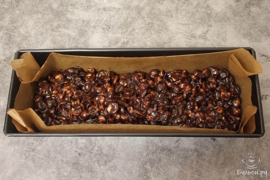 6. Форму для выпечки покройте пекарской бумагой, смажьте растительным маслом и выложите готовую смесь, разровняйте.