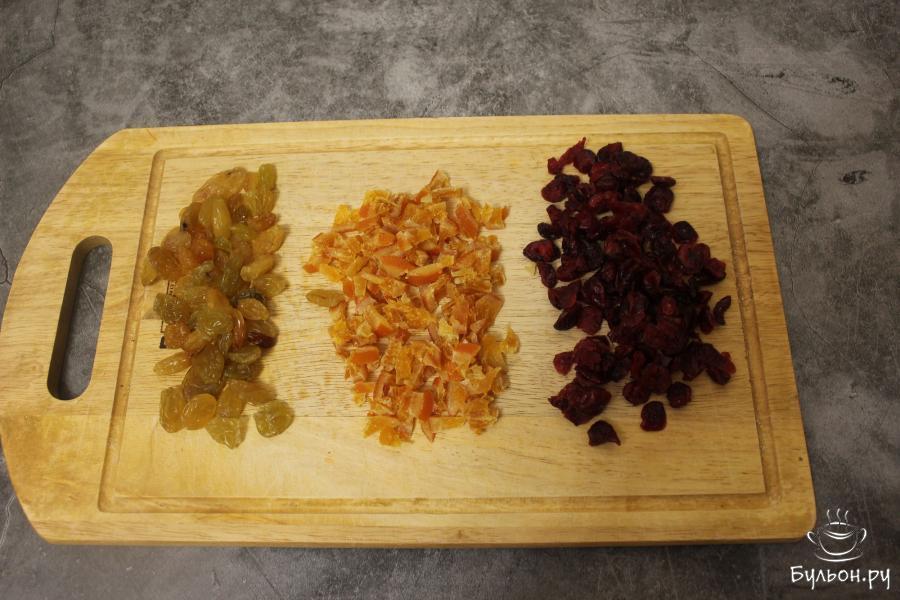 3. Апельсиновые цукаты нарежьте небольшими кусочками. Промойте сушенную клюкву и изюм, обсушите их на полотенце.