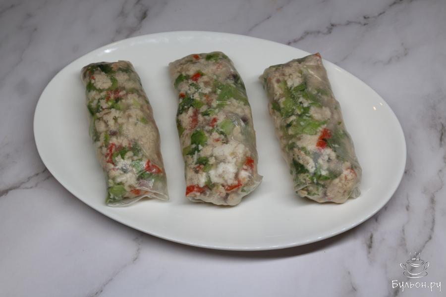 6. Затем сверните начинку во внутрь, сложив в начале боковые стороны бумаги, а затем скрутив рулетик. Таким образом сформируйте все спринг-роллы.