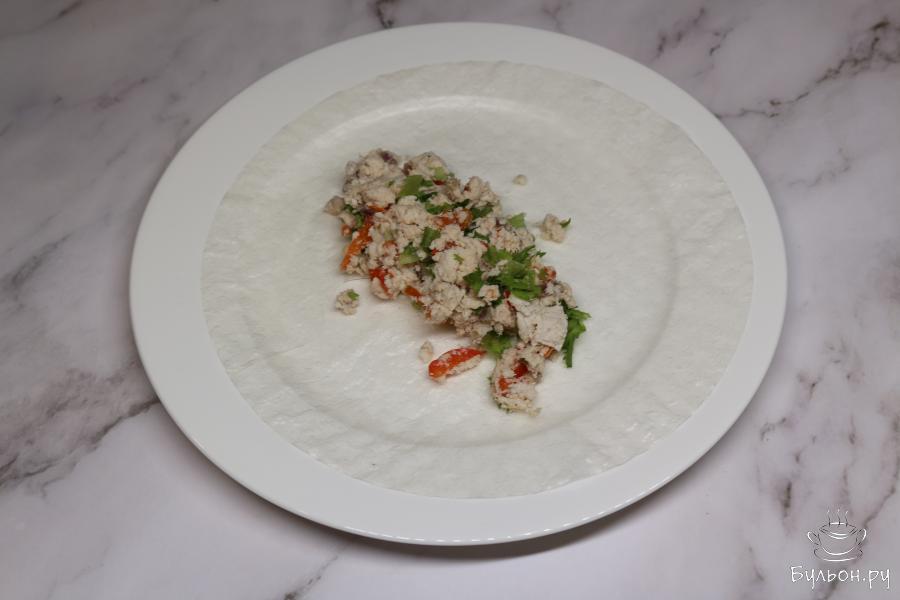 5. Рисовую бумагу намочите в холодной воде, опустив лист в воду на секунд 40. Когда лист станет мягким, промокнув его полотенцем, выложите на тарелку. В центр положите четверть всей начинки.
