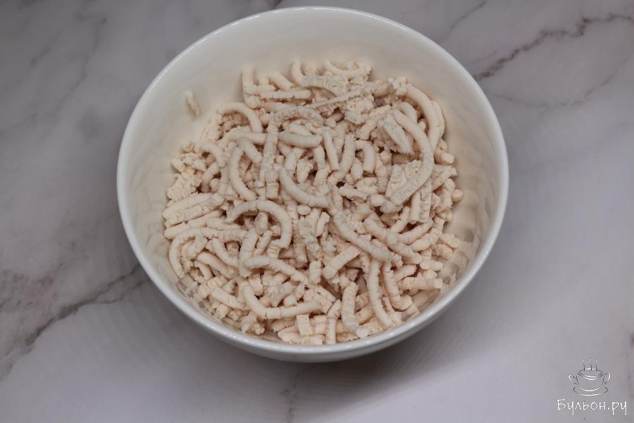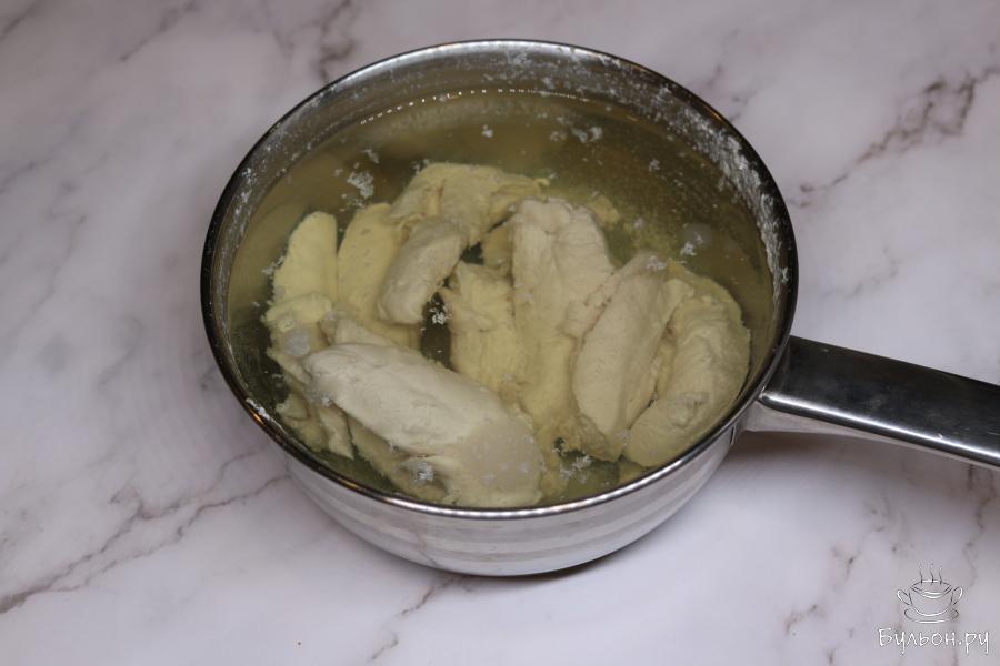 4. Куриное филе пропустите через мясорубку. Смешайте фарш с перцем, луком и фриллисом. При необходимости еще подсолите. Все ингредиенты перемешайте.