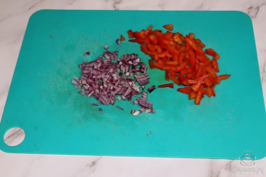 2. Красный лук мелко порубите кубиками, красный перец нарежьте маленькими полосками. Выложите их в сковороду вок и тушите на сильном огне с водой, воду добавляйте по мере ее испарения. Доведите овощи до мягкости.