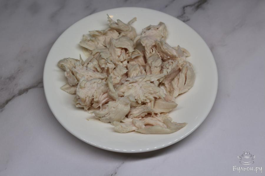 1. Отварите филе курицы в соленой воде в течение часа. Затем достаньте кусочки, немного остудив их, порежьте на небольшие кусочки. Обращаю внимание, что для рецепта потребуется 60 грамм уже отварного филе.