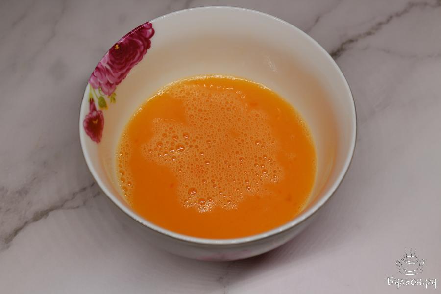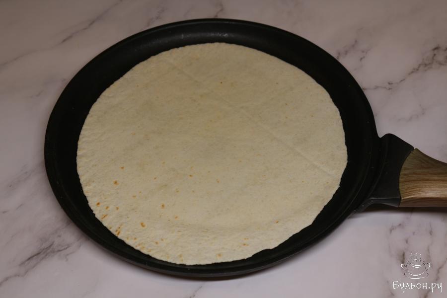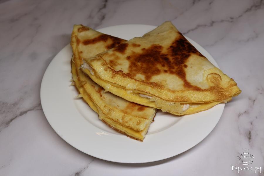 5. Сверху на нее влейте массу из яиц, накройте крышкой. Как только схватится яйцо, добавьте куриное филе и сыр, сложите лепешку пополам.