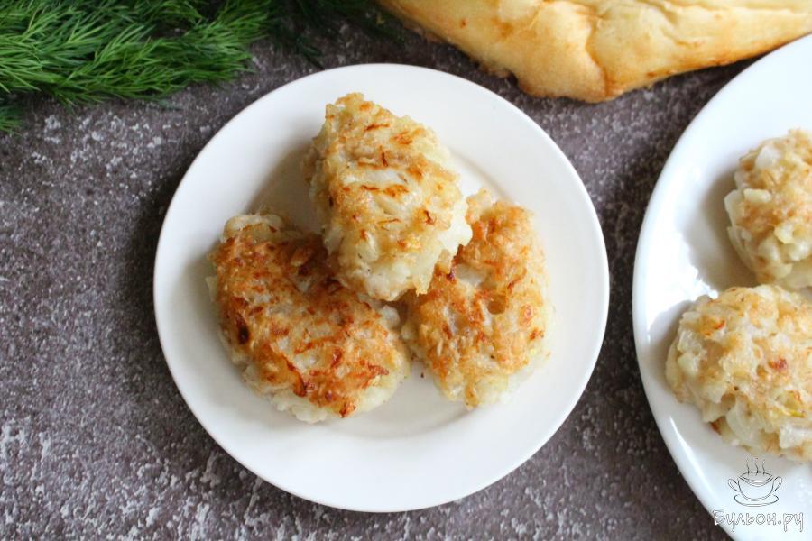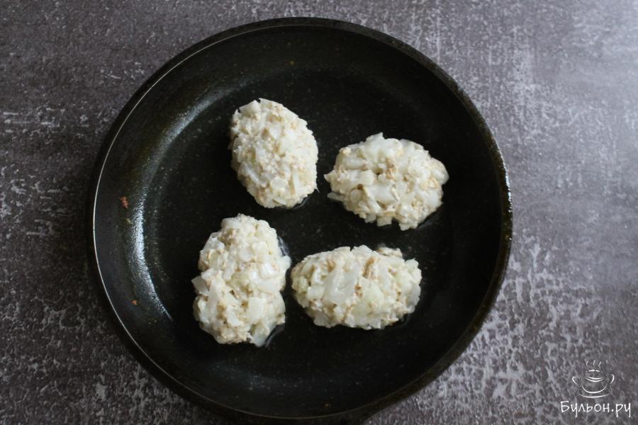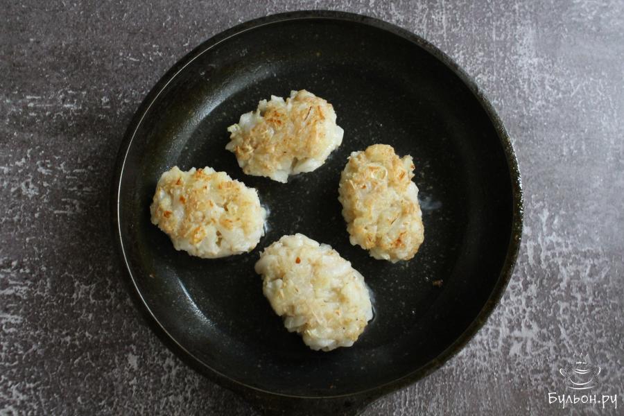7. На сковороде разогреть масло. Руки смачивать водой, формировать небольшие котлетки. Жарить котлеты до румяного цвета, на не очень сильном огне.