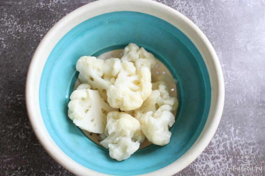 2. Цветную капусту разделить на соцветия, промыть и сварить капусту в кипящей воде 10 минут. Капусту откинуть на дуршлаг.