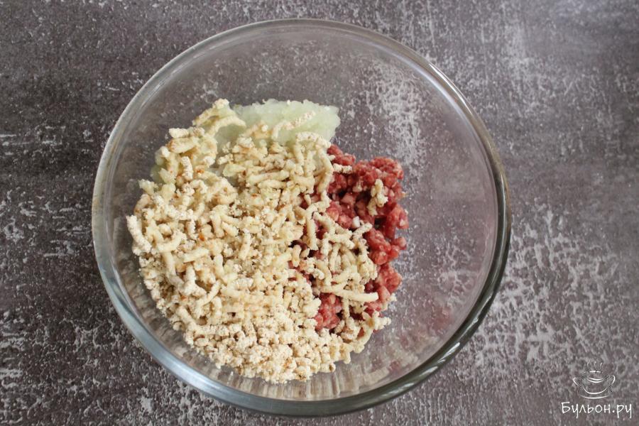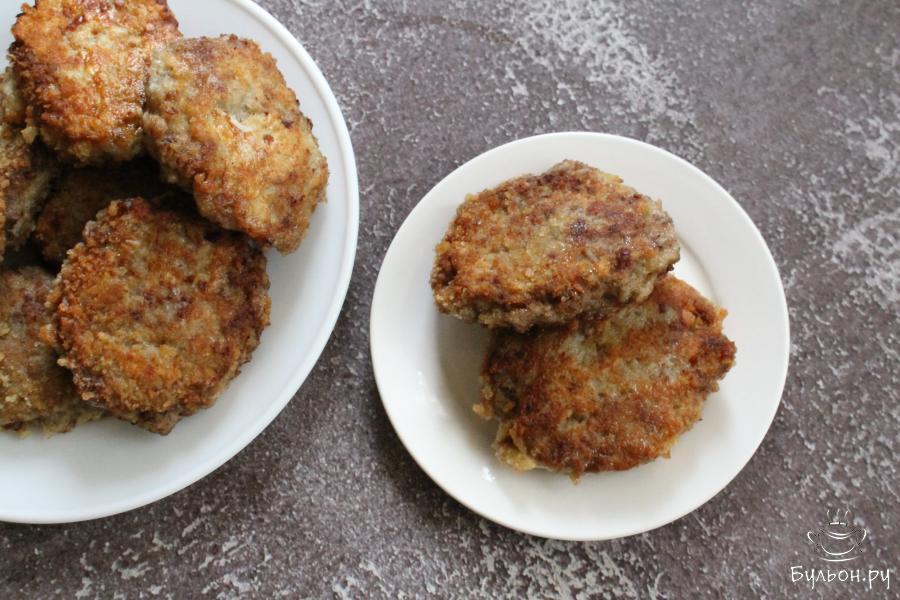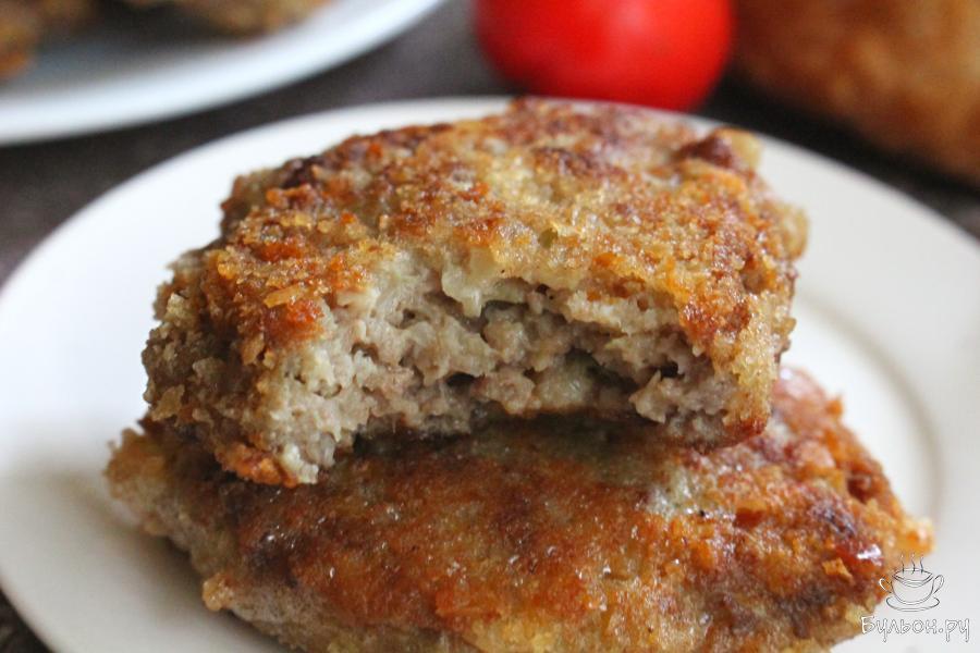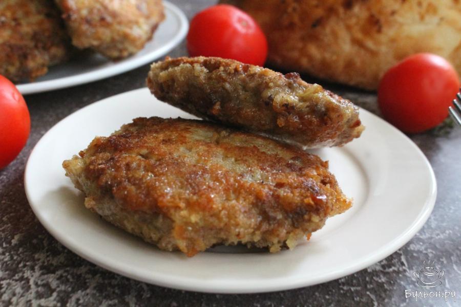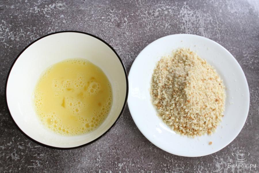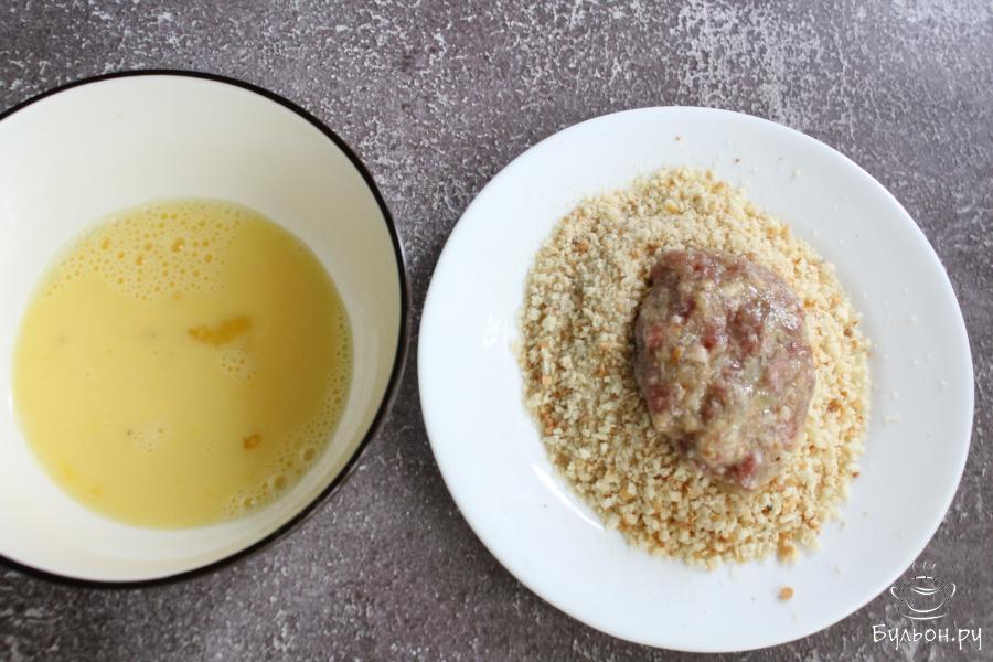 4. Руками из фарша формировать плоские овальные котлетки, обмакнуть их в яйцо, а затем обвалять с двух сторон в сухарях.