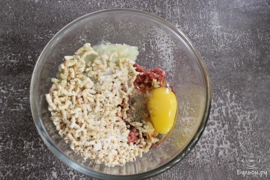 2. Вбить в чашку яйцо, добавить перец и соль по вкусу. Фарш перемешать и отбить. Отбить фарш можно приподнимая его над чашкой и бросая обратно, чтобы фарш бился об чашку.