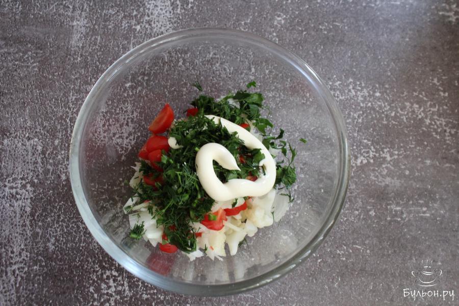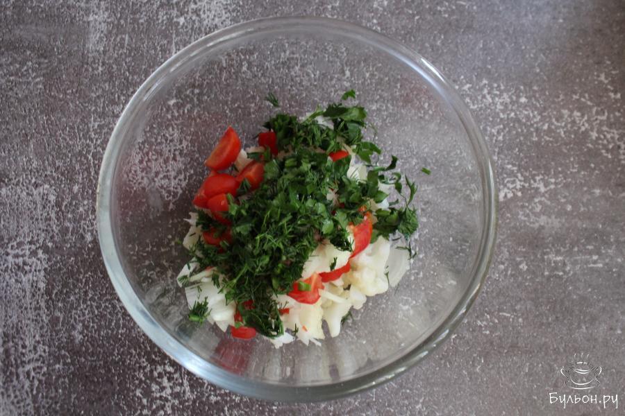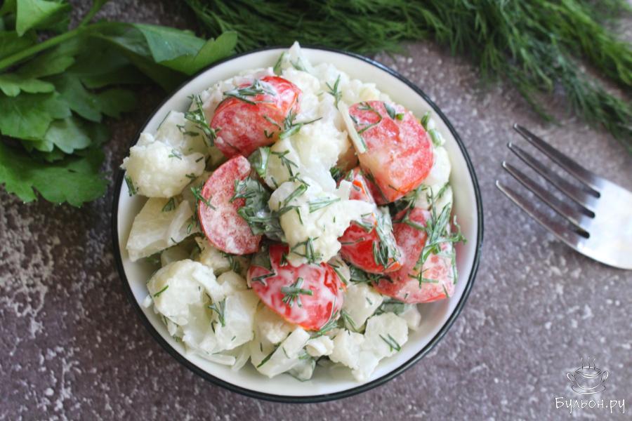 Салат из цветной капусты с помидорами и луком готовится просто и быстро. Все ингредиенты можно менять в пользу своего любимого. Нравится в салате больше помидоров или капусты - добавляем больше и наоборот. Зелень для приготовления салата каждый выберет ту, которая больше нравится. Цветную капусту варим до такой степени мягкости, которая вам больше подходит, многие любят овощи аль денте. Салат получается легкий, вкусный, сочный и яркий.