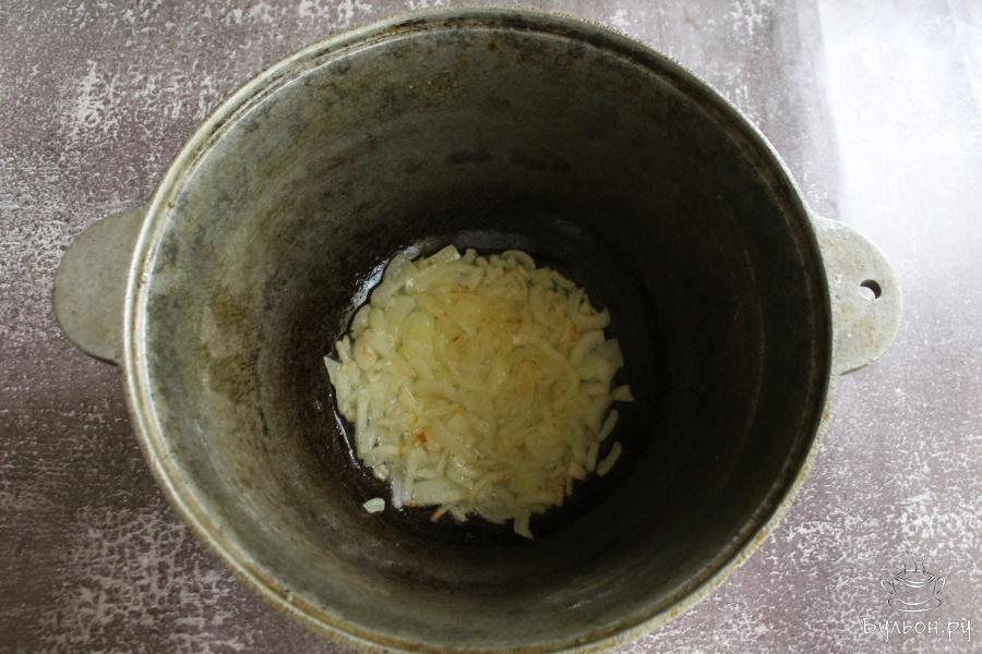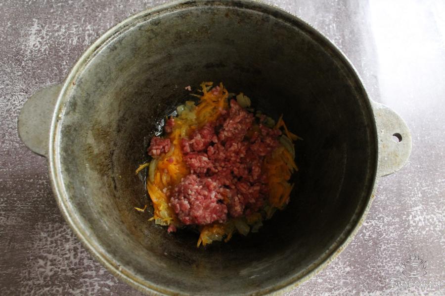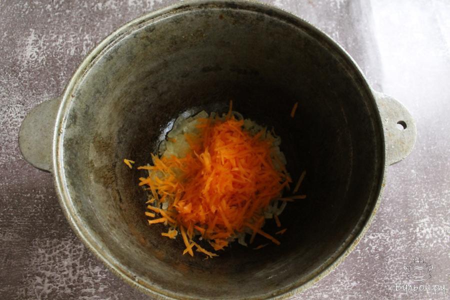 3. Тыкву почистить, промыть и натереть на крупной терке. Добавить тыкву в казан и обжарить все вместе пару минут. Помешивать.