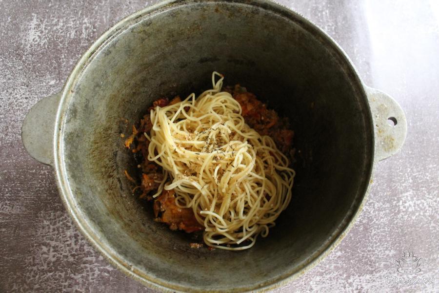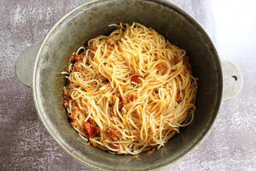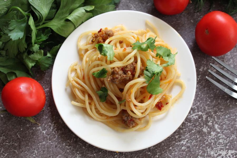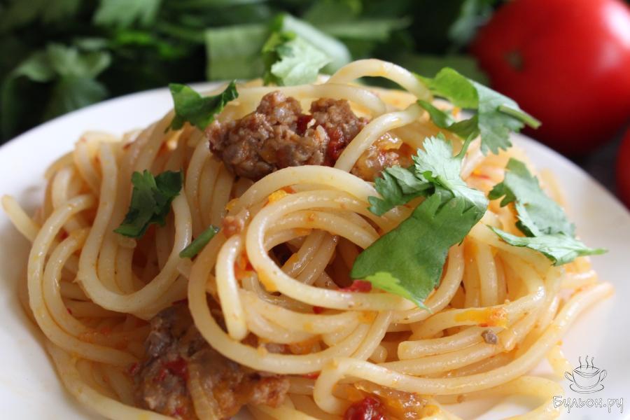 1. Спагетти сварить в кипящей воде до полуготовности, руководствуясь инструкцией на упаковке. Откинуть спагетти на дуршлаг.