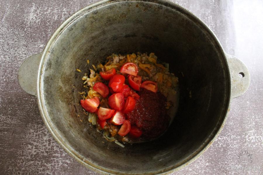 5. Помидоры промыть, нарезать дольками, выложить в казан, добавить кетчуп и воду. Готовить еще несколько минут, помешивать.