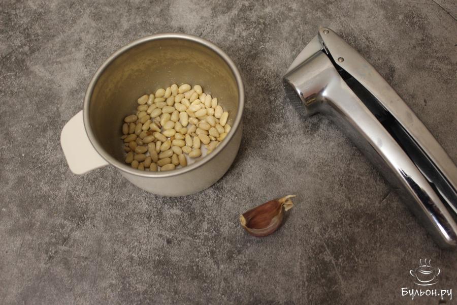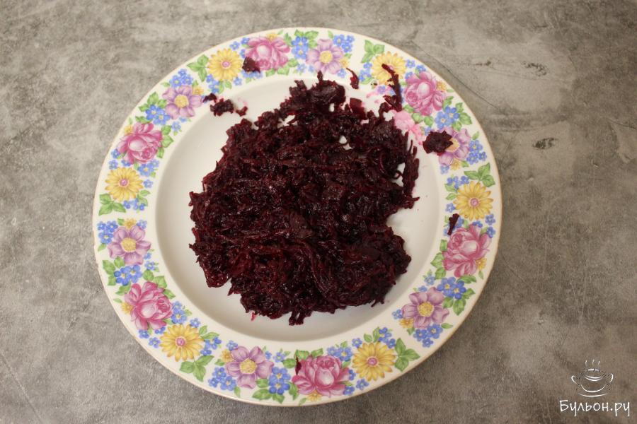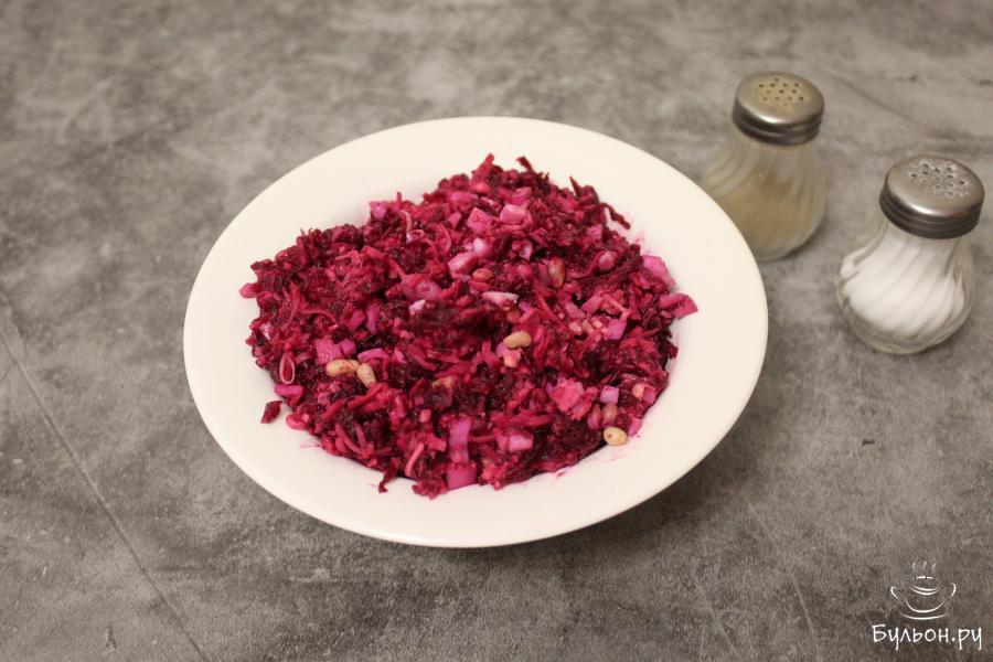 3. В миску к свекле выложите натертый сыр, всыпьте кедровые орешки и добавьте чеснок, пропущенный через пресс.