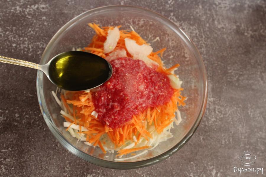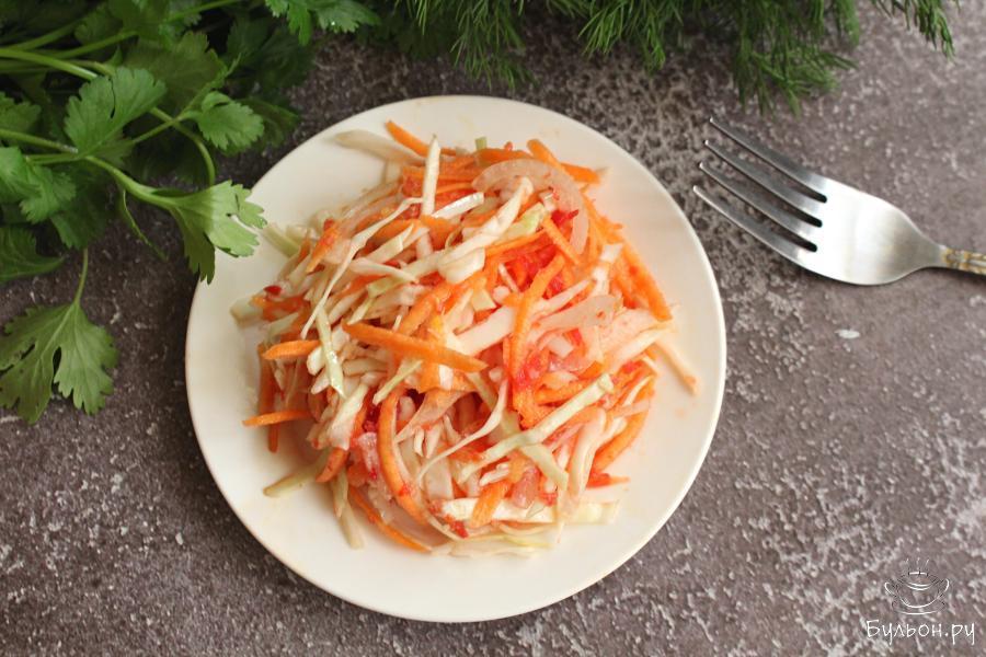 К повседневному столу, к постному, для вегетарианского меню - попробуйте приготовить салат из свежей капусты с морковью, луком и томатами. Такой салат готовится за считанные минуты, он получается очень сочный, яркий, вкусный и полезный. Этот легкий салат можно предложить к обеду, ужину или даже просто на перекус в течение дня. Количество овощей можно менять, добавить больше тот ингредиент, который вы любите.
