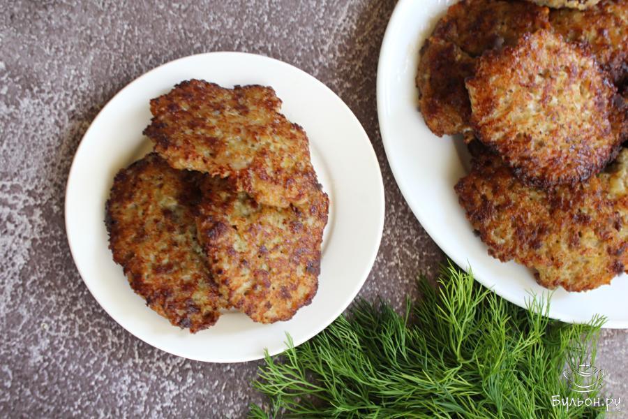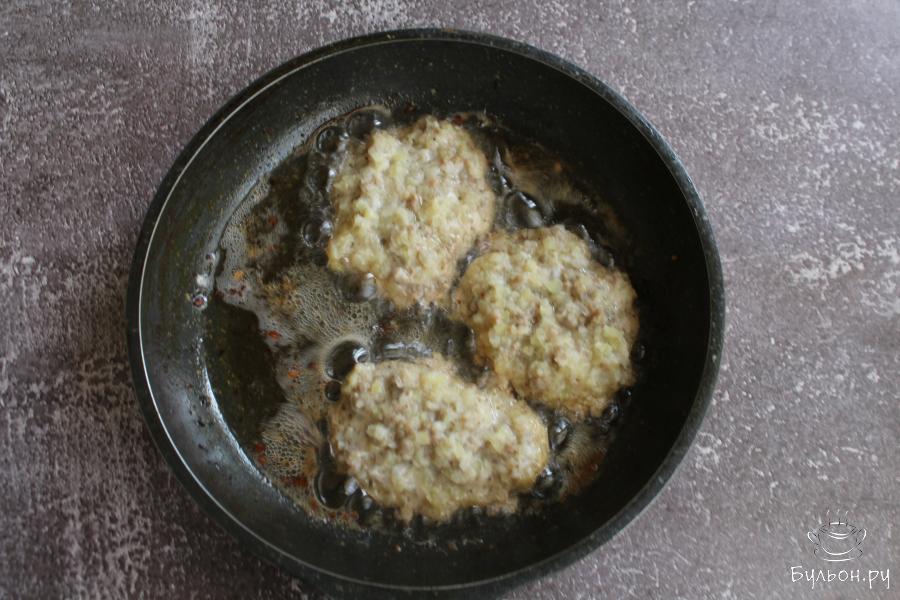 3. На сковороде разогреть масло. Столовой ложкой выкладывать фарш. Жарить оладьи на небольшом огне, под крышкой, до румяного цвета с одной стороны.