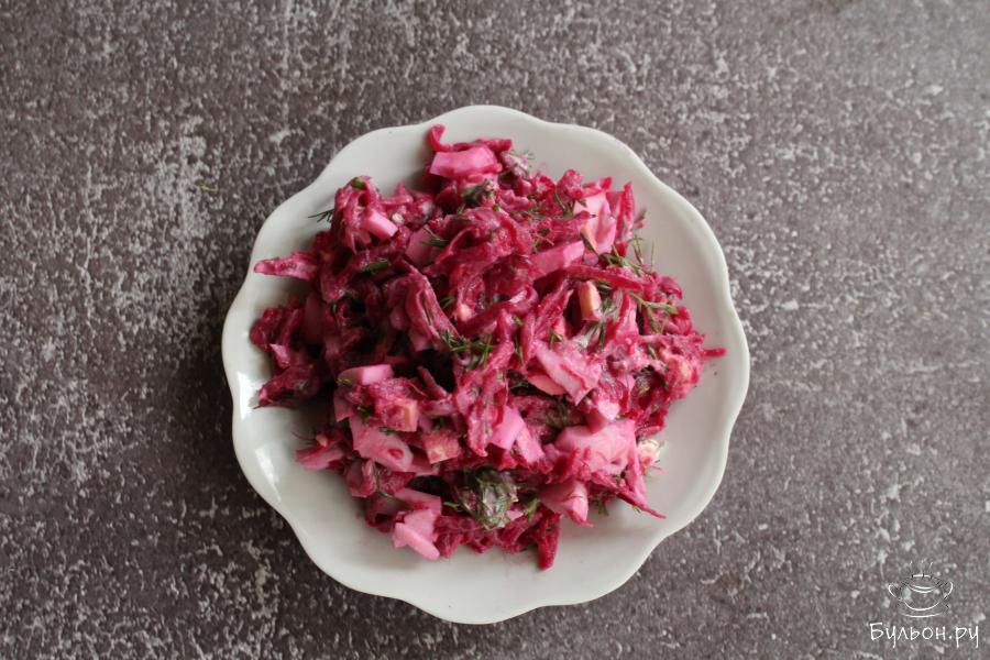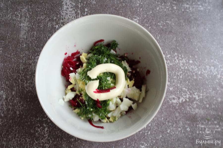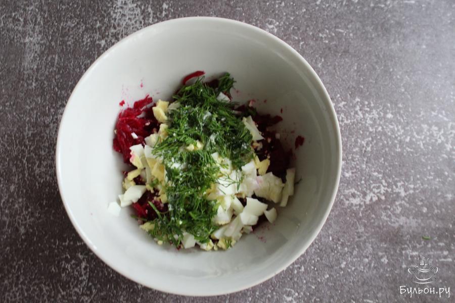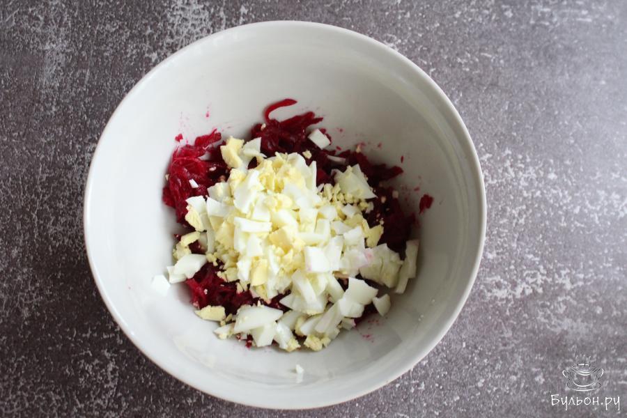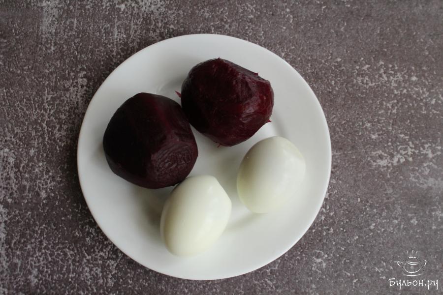 1. Свеклу промыть, залить водой и сварить до мягкости. Остудить свеклу и почистить. Яйца сварить вкрутую, остудить и почистить.