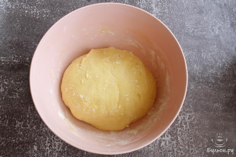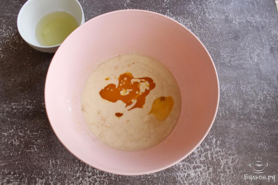 3. Добавить в чашку растопленное сливочное масло и яйца. Один белок оставить для смазывания булочек.