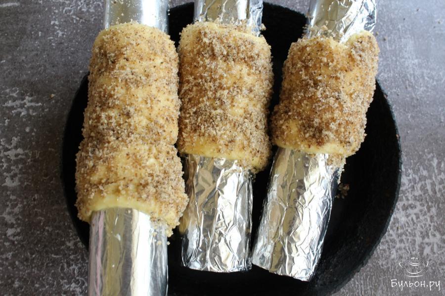 5. В это время орехи прокрутить через мясорубку и смешать их с оставшимся сахаром и корицей. Любые картонные трубочки обернуть фольгой.