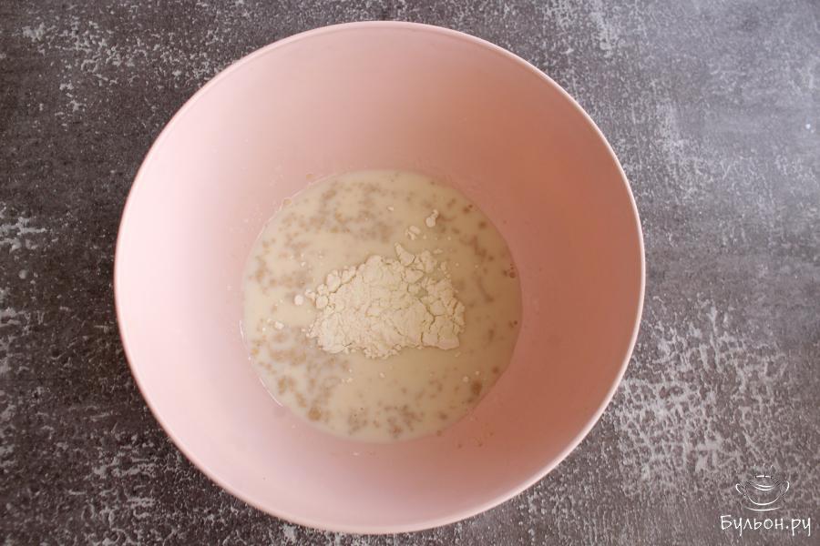 2. Добавить в чашку теплое молоко и 2 ст. л. муки. Перемешать и оставить опару на 15-20 минут в тепле.
