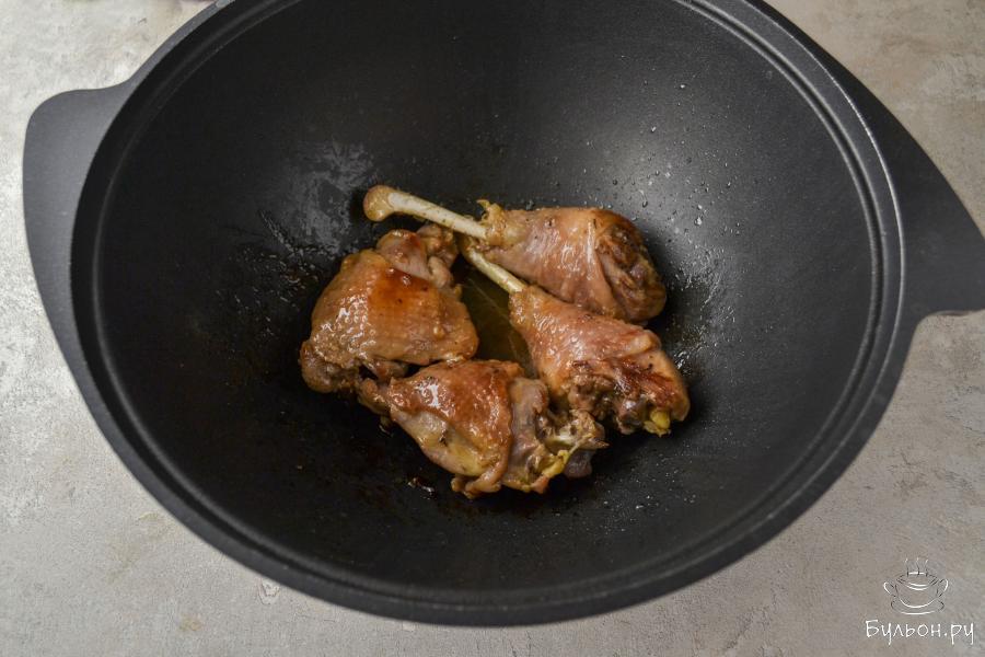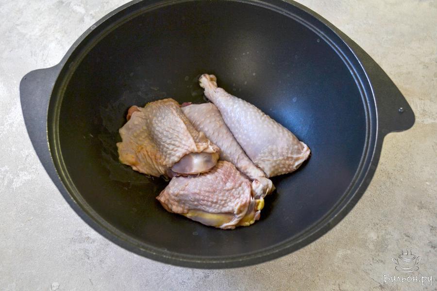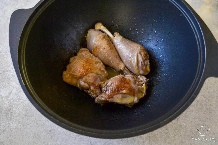 1. Вымойте курицу, разрежьте ее на кусочки. Разогрейте казан с растительным маслом и отправьте туда мясо.