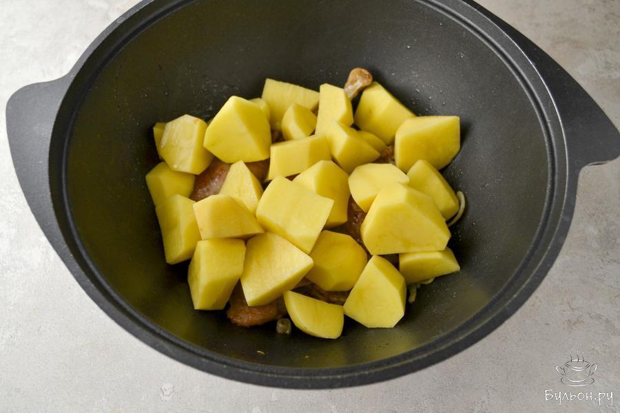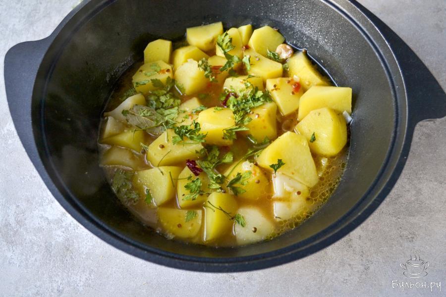 6. Влейте горячую воду, посолите. Доведите до кипения, сделайте огонь ниже среднего и тушите почти до мягкости картошки.