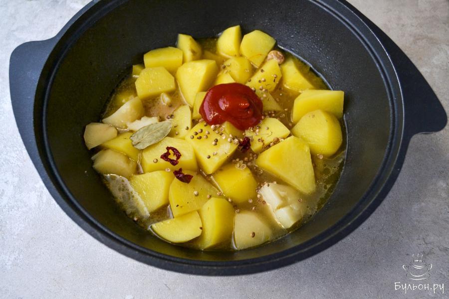 7. Примерно через 20 минут добавьте в казан кетчуп, лавровый лист, кориандр, перец чили или другие специи, которые предпочитаете.