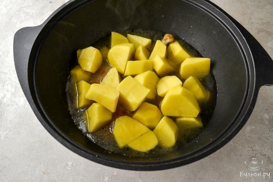 2. На сильном огне обжарьте кусочки 5-7 минут. Во время обжаривания поворачивайте кусочки, чтобы они равномерно покрылись румяной корочкой со всех сторон.