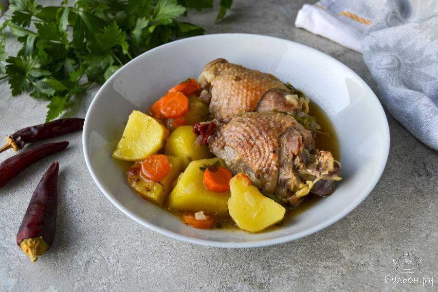 Для приготовления этого блюда можно взять любую часть курицы: грудку, голени, бедра, крылышки. Обжарить куриное мясо до румяной корочки, добавить морковь и лук. Когда овощи немного обжарятся, добавить нарезанную картошку и горячую воду. Тушить блюдо до мягкости картофеля. Кроме моркови и лука можно положить помидоры или кетчуп, сладкий перец, цветную капусту, тыкву, добавить любимые специи и приправы. В общем, основные ингредиенты - это куриное мясо и картофель, а овощи можно добавлять любые, которые у вас есть. Блюдо получается очень вкусное и сытное. От количества воды будет зависеть густота блюда.