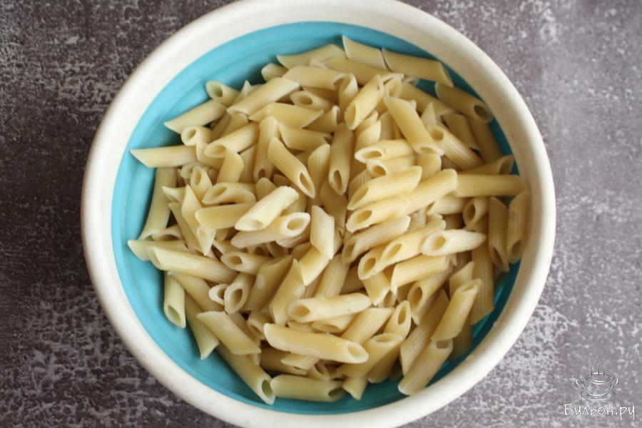 1. Макароны сварить в кипящей воде, руководствуясь инструкцией на пачке. Откинуть готовые макароны на дуршлаг.