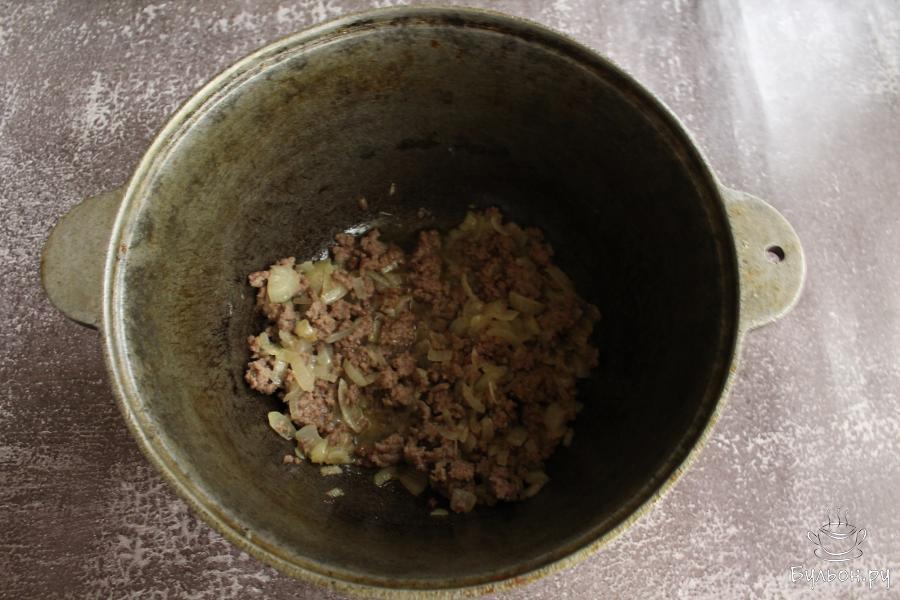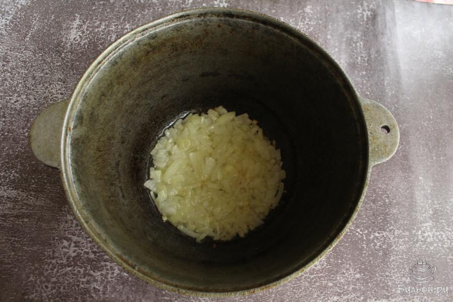 2. Лук почистить, промыть и мелко нарезать. Обжарить лук в казане на разогретом масле, до полуготовности.