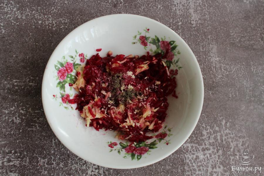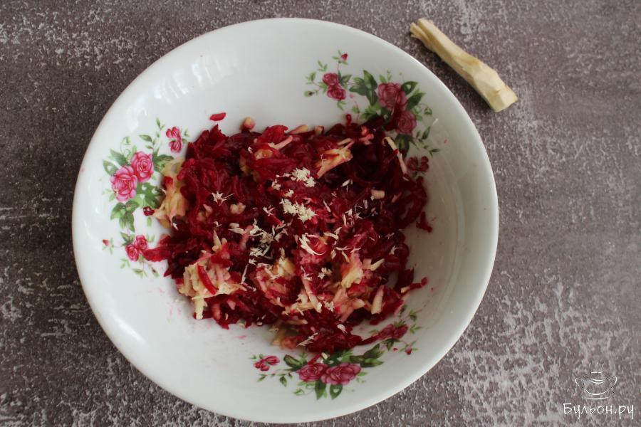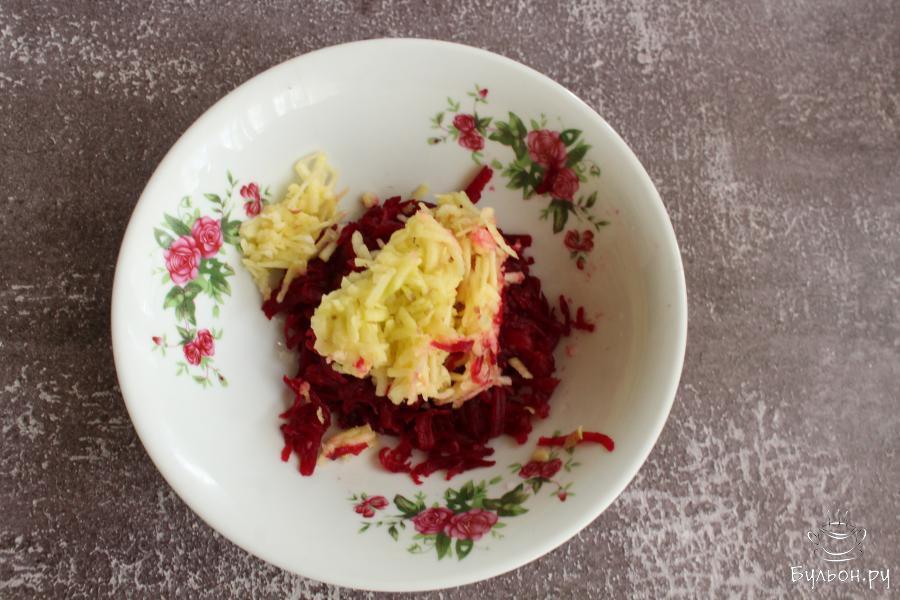 3. Яблоки почистить и тоже натереть через крупную терку. Сразу перемешать салат, чтобы яблоко не потемнело.