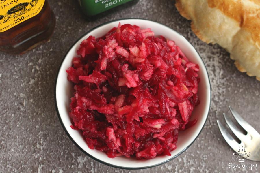 Постный салат из вареной свеклы с яблоком и хреном - отлично подойдет как к постному и вегетарианскому меню, так и просто к повседневному столу. Салат легкий, сочный, полезный и очень вкусный. Благодаря добавлению корня хрена, салат получается с пикантным вкусом и небольшой остринкой. Яблоки для приготовления выбирайте кислых сортов. Винный уксус можно заменить лимонным соком, а масло используйте любое растительное, которое вам нравится.